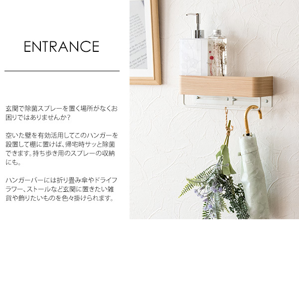 フェイスタオルを半分に折って掛けるのに丁度良いコンパクトサイズでハンガーの上にはディフューザーやボトルなどを収納できる便利な棚付き。