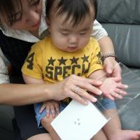 【1】赤ちゃんの手にcdケースなどの透明板をあてがってデジカメでパチリ
