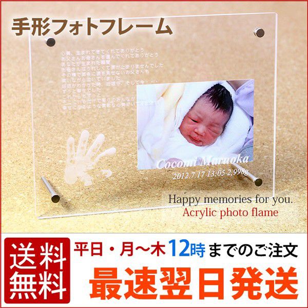 赤ちゃん誕生記念にご家族やおじいちゃんおばあちゃんへの贈り物にも最適! 出産祝い用のギフトとしても承ります ※フォトフレームの写真は自由に差し替えが出来ます この商品は、アクリル製フォトフレームに高性能レーザー加工機で名前などを彫刻します。 アクリル製なので割れづらく安全で、半永久的に残るメモリアル商品です。 | |
