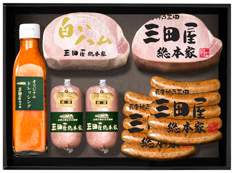 | 品 名 | 三田屋ギフトセットSS-100 | 内 容 | ロースハムブロック300g 白いハムブロック300g チューリンガーウインナー120g×2 サルティーチャーソーセージ130g×2 ドレッシング200ml |