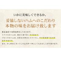 | 備 考 | 【ハム製品について】、製造過程で加熱処理をしております。スライスのハムは、袋から取り出しそのままお召し上がり頂けます。ブロックのハムは、お好みの厚さにスライスし、そのまま食べて頂けます。また、少し厚めにカットしハムステーキとしてもお召し上がり頂けます。 |