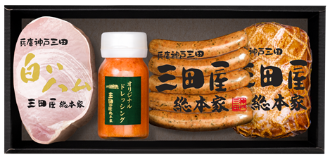 | 商品説明 | 三田屋総本家独自の製法で仕上げたロースハムとモモハム、パセリをちりばめたあっさり味のウインナー、更にオリジナルドレッシングが入ったおすすめセットです。 |