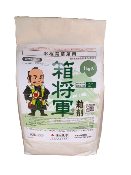 | 稲(箱育苗) | いもち病 紋枯病 穂枯れ (ごま葉枯病菌) もみ枯細菌病 内穎褐変病 白葉枯病 イネミズゾウムシ イネドロオイムシ ウンカ類 ツマグロヨコバイ ニカメイチュウ イネツトムシ フタオビコヤガ コブノメイガ | 育苗箱 (30x60x3cm 使用土壌約5L) 1箱当り50g | 移植7日前〜移植当日 | 1回 | 育苗箱の上から 均一に散布する |