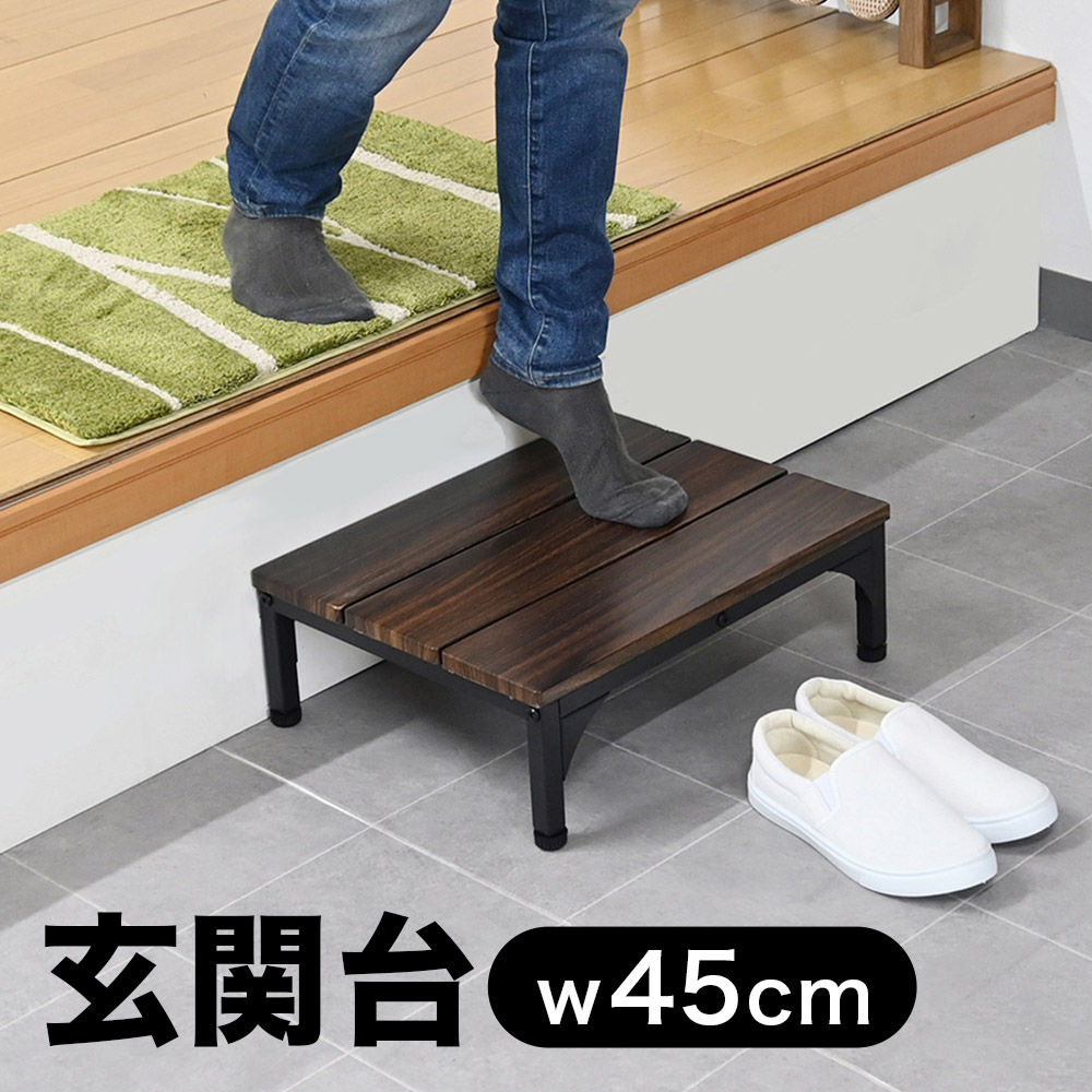 | 玄関の段差を小さくし、お年寄りの足腰の負担を和らげます。 また、転倒抑制にもなるので、小さなお子様のいるご家庭にもオススメです。 耐荷重は100kg。奥行も35cmと深めで使いやすく、足が大きめの成人男性でも使いやすい天板サイズ。 さびやキズに強い紛体塗装を施したスチールフレームに木目の天板といったシンプルなデザインに、45.60.90.120cmの4種のサイズがございますので、幅広いスタイル・広さの玄関にフィット。 天板下に靴やスリッパなどを収納できるので、玄関スペースを有効活用できます。 アジャスター付きで、勾配のある玄関でも水平に設置可能。各サイズ、天板下に1〜6足程度、靴や履物を収納出来ます。 |