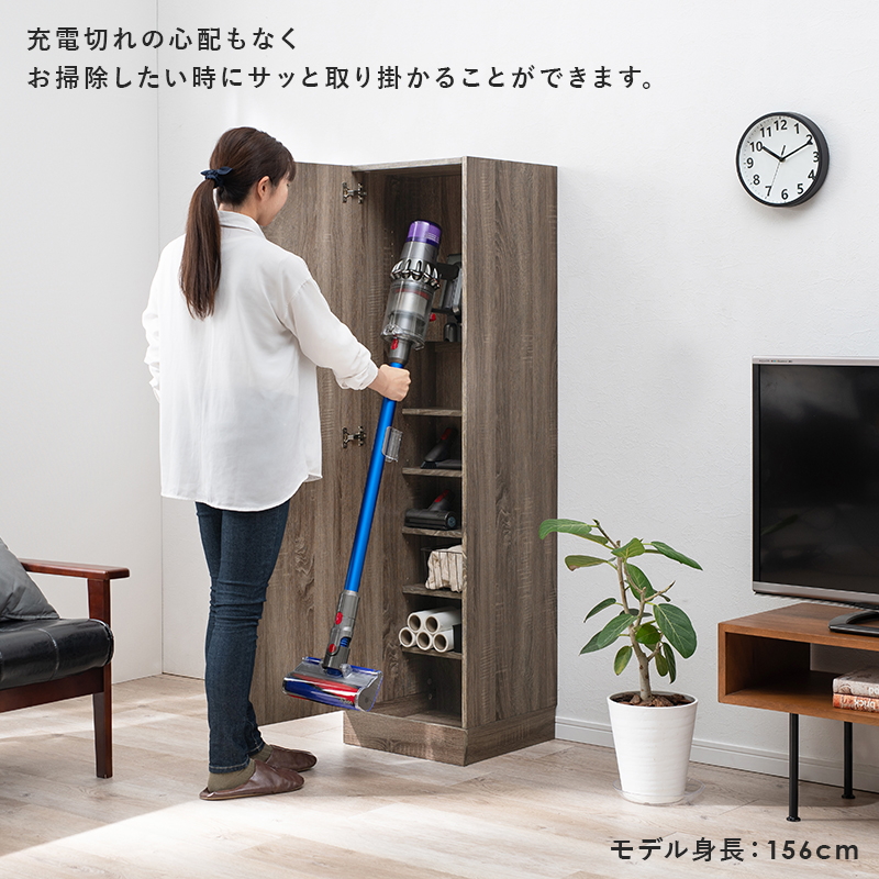 掃除用具がまとめて収納できる掃除機収納庫。背面からコードを通せるので収納時に充電も可能です。