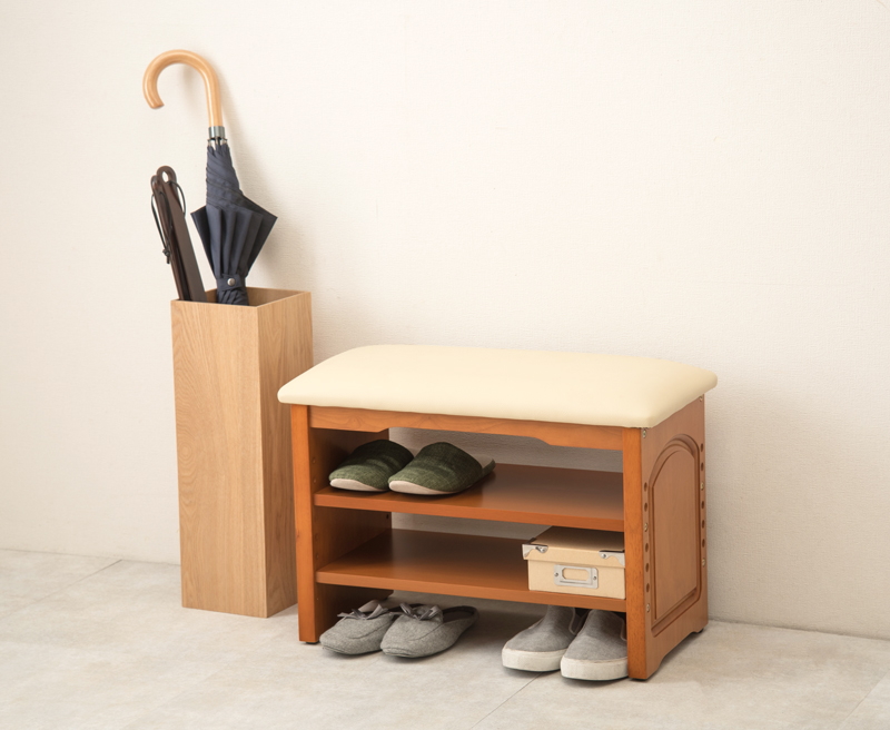 | 靴の脱ぎ履きに便利な玄関ベンチ。座面下は2段の棚で靴やスリッパの収納スペースになります。 |