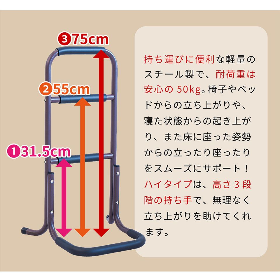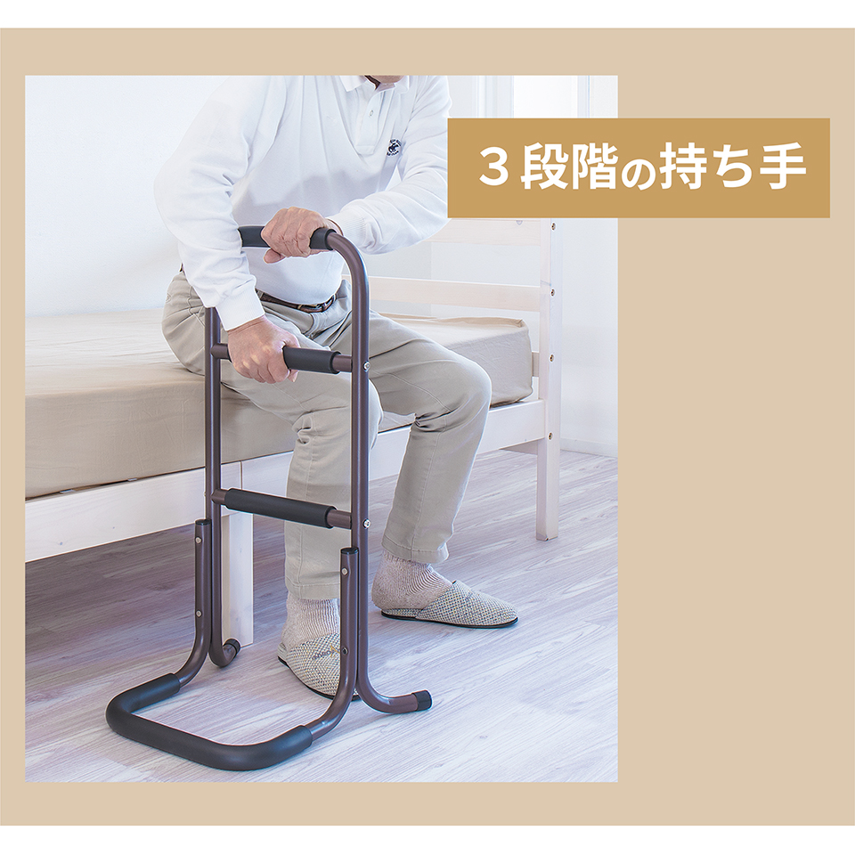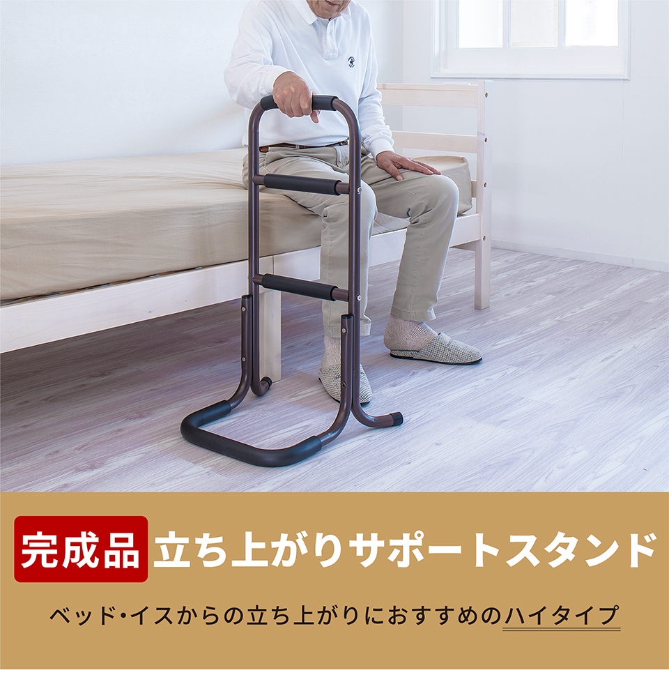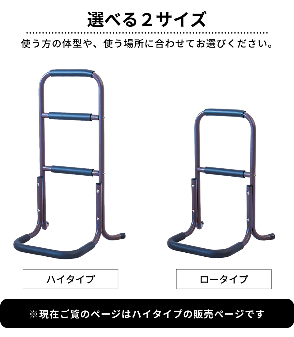 | 座った状態から立ち上がる際に足腰の負担を軽減できるサポートスタンドです。立ち上がり補助 サポートスタンド3段の特徴。座った状態から立ち上がるときにつかんで体重をかけられる、立ち上がりサポート用の移動式手すりです。手すり部分にはやわらかなクッションが巻かれており、しっかり握り込みやすくなっています。体重を預けてもしっかり支えてくれる丈夫な土台を採用しております。椅子やトイレ等のそばに置いて使用すれば、つらい立ち上がりがぐっと楽になります。そのほかにもベッドから立ち上がる時、玄関口の段差を上がる時など、様々な場所で活躍します。重量は2.32kgと比較的軽量なため移動もラクラク。身長など体型や使用場所に応じて2タイプご用意しています。 |