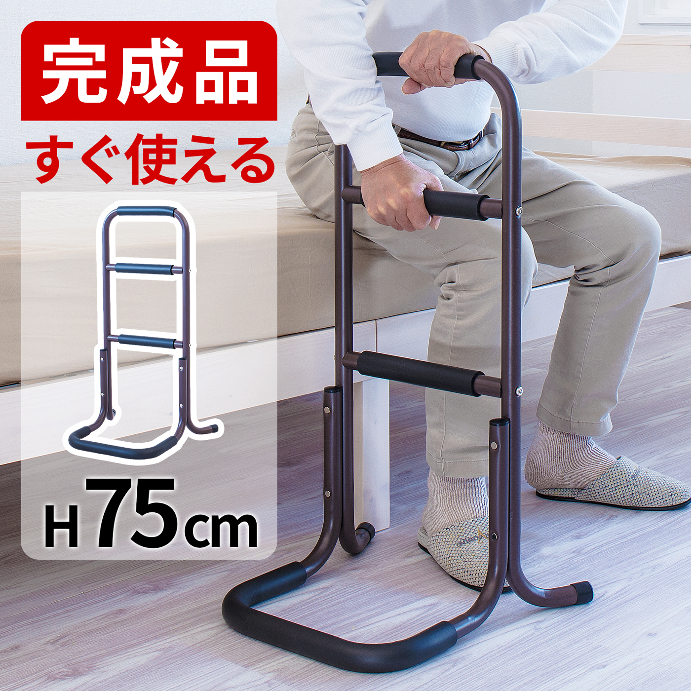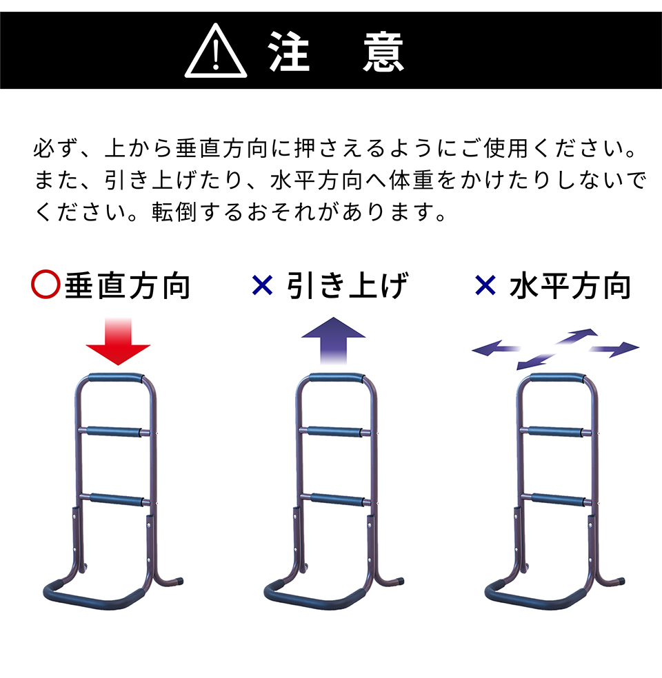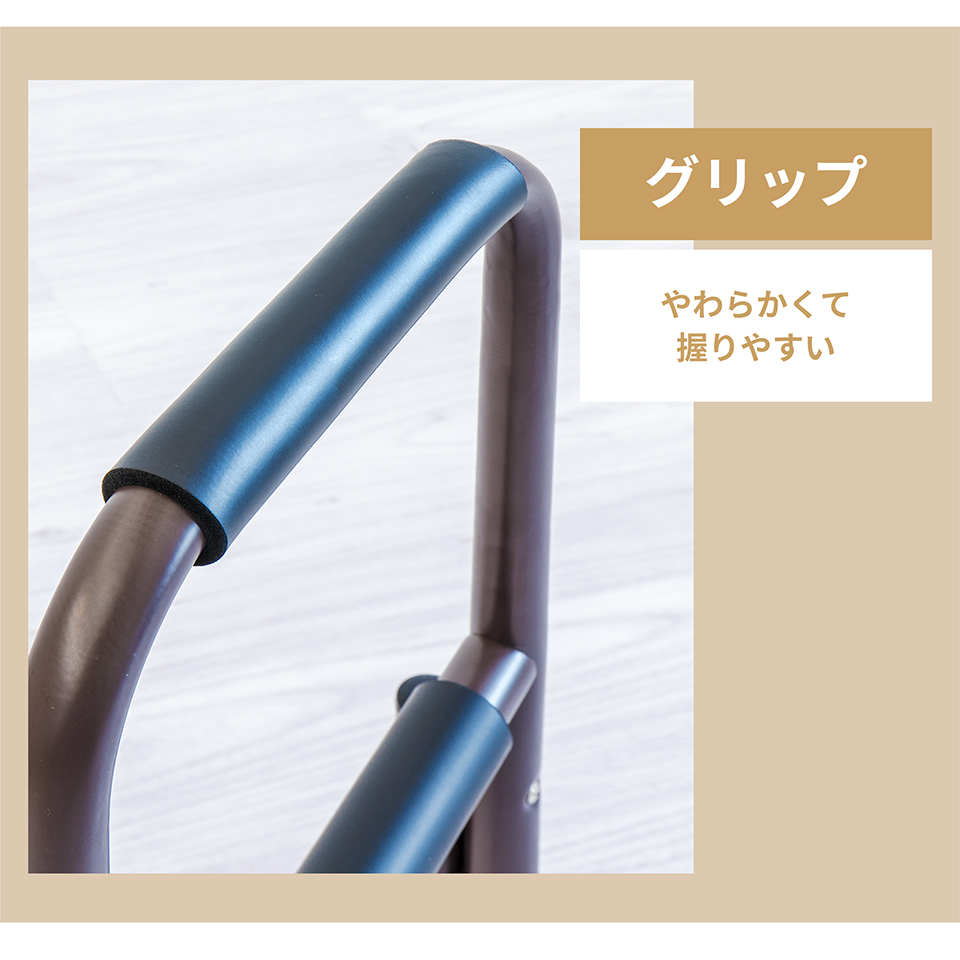 | 座った状態から立ち上がる際に足腰の負担を軽減できるサポートスタンドです。立ち上がり補助 サポートスタンド3段の特徴。座った状態から立ち上がるときにつかんで体重をかけられる、立ち上がりサポート用の移動式手すりです。手すり部分にはやわらかなクッションが巻かれており、しっかり握り込みやすくなっています。体重を預けてもしっかり支えてくれる丈夫な土台を採用しております。椅子やトイレ等のそばに置いて使用すれば、つらい立ち上がりがぐっと楽になります。そのほかにもベッドから立ち上がる時、玄関口の段差を上がる時など、様々な場所で活躍します。重量は2.32kgと比較的軽量なため移動もラクラク。身長など体型や使用場所に応じて2タイプご用意しています。 |