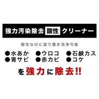 | 塗り置きができる強力酸性洗剤 お風呂、トイレ、シンクなどの水回り用酸性洗剤。 水あかや石鹸カス、鏡のうろこやトイレパイプの青さびなど、汚れの箇所に塗布し暫く放置したあと擦り洗いするだけ。 強力な酸性ながらステンレス・アルミなどの金属にも使用が可能。 汚れのタイプ ●水あか●石鹸カス●コケ●青サビ●赤カビ●黒ずみ●皮脂汚れ 用途詳細 ●水陶磁器●鏡●ステンレス●アルミ●ホーロー●銅(真鍮)メッキ 使用できないもの 天然石全般、粘着剤つき印刷化粧板フィルム |