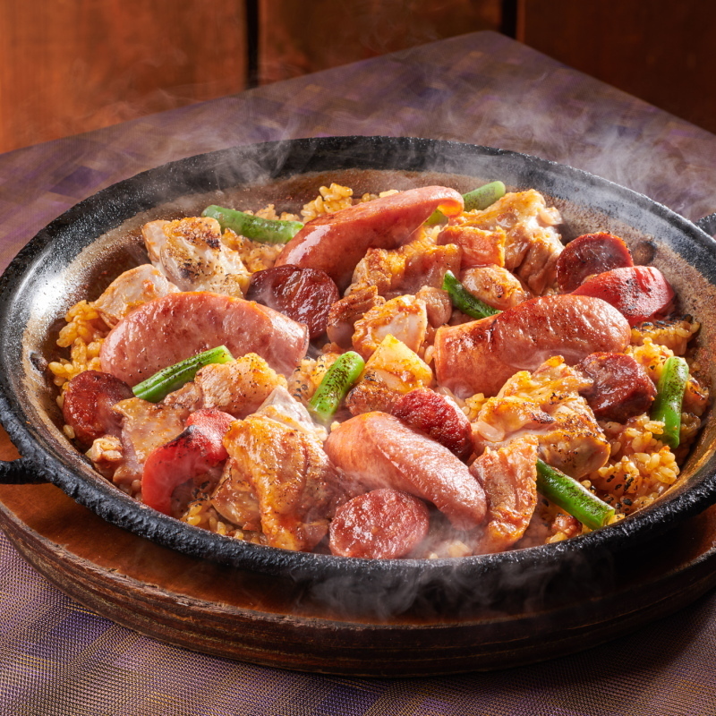 チョリソー、スペイン産栗豚、鶏肉をオリーブオイルでニンニク、玉ねぎとしっかり炒め素材の旨みを出し、国産米にお肉の旨みを染み込ませたちょっとピリ辛が病みつきになるお肉のパエリアをお楽しみください。