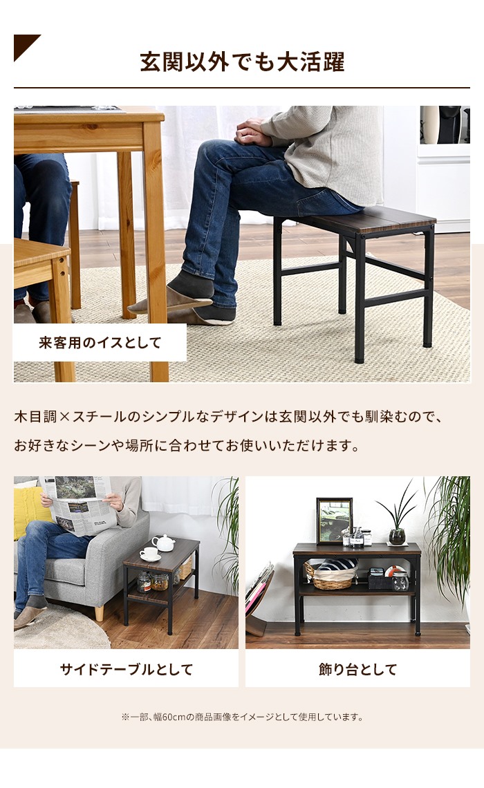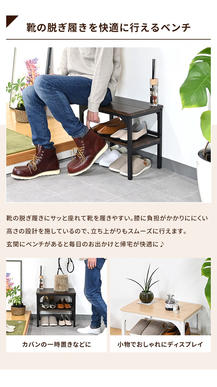 | 靴の脱ぎ履きにサッと座れて靴を履きやすく、立ち上がりもスムーズに。 ベンチがあれば、ロングブーツもらくらく。 お出かけ前や帰宅時に、鞄などの一時置きスペースとしても便利です。 |
