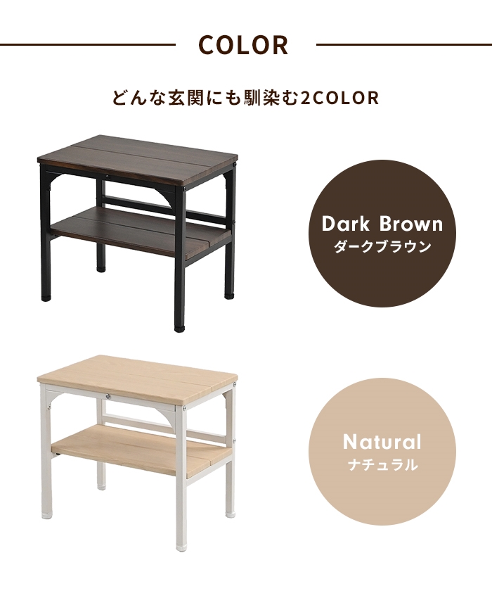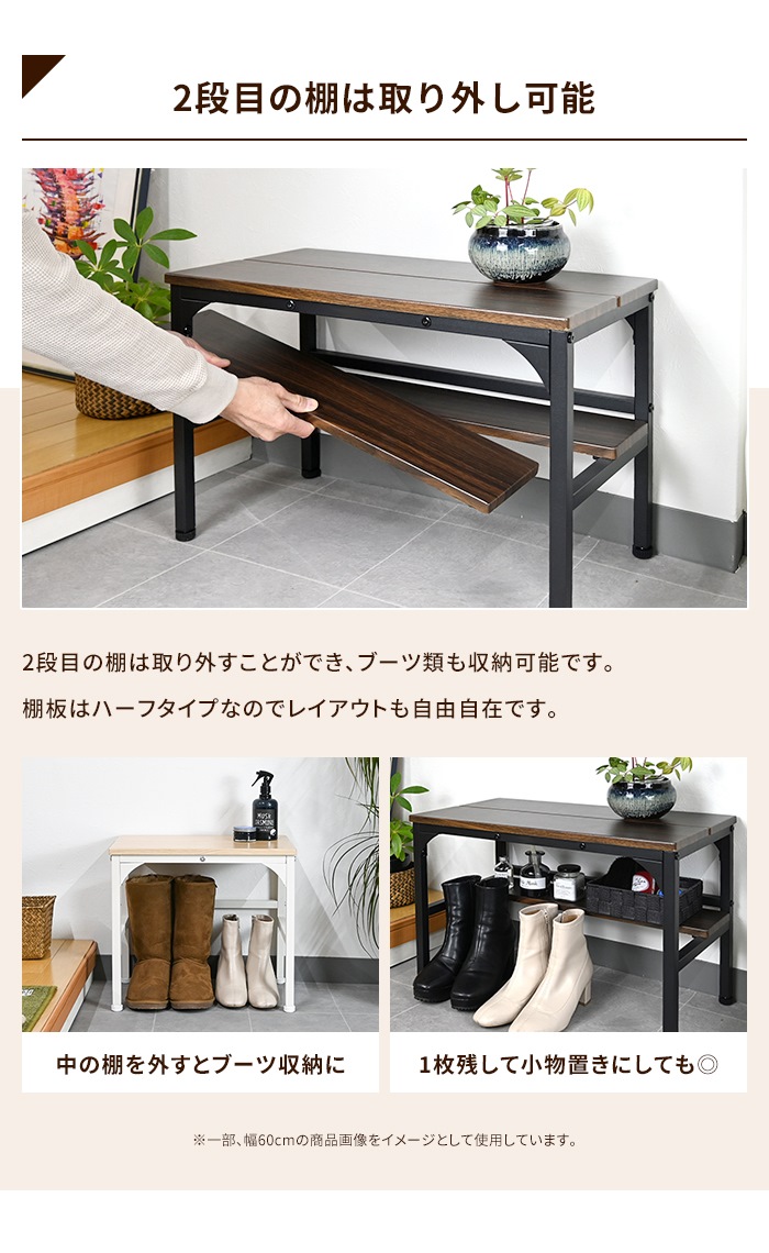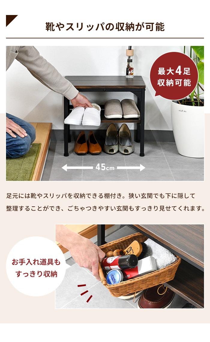 | ・膝に負担がかかりににくい高さの設計を施しています。 ・場所を選ばないスリム設計なので、玄関がすっきり整います。 ・ベンチ下の2段の収納スペースには、最大4足の靴が収納できます。 ・棚板は取り外すことができるので、ハイカットブーツなど高さのある靴も収納できます。 ・アジャスター付きで、勾配のある玄関でも水平に設置できます。 |