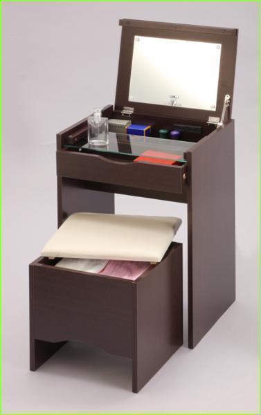 2口コンセント付でお化粧・メイクに便利な機能。 ガラステーブルで収納部分が見えるのですっきり整理できちゃいます。 引き出し付きなので小物の収納にも役に立ちます。 スツールは収納可能でうれしいセット販売です。