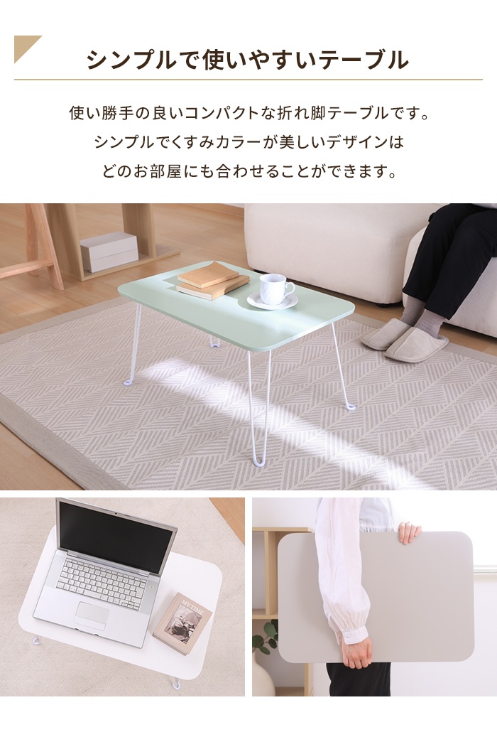 | テーブル 折りたたみ ローテーブル 幅60 奥行40 完成品 サイドテーブル コンパクト 省スペース 隙間収納 簡易 くすみカラー フォールディングテーブル リビングテーブル テーブル 折り畳み式テーブル ロータイプ 勉強机 学習デスク 座卓 折れ脚 スリム コンパクト 省スペース リビング ワンルーム グレージュ グリーン ブルー ホワイト |