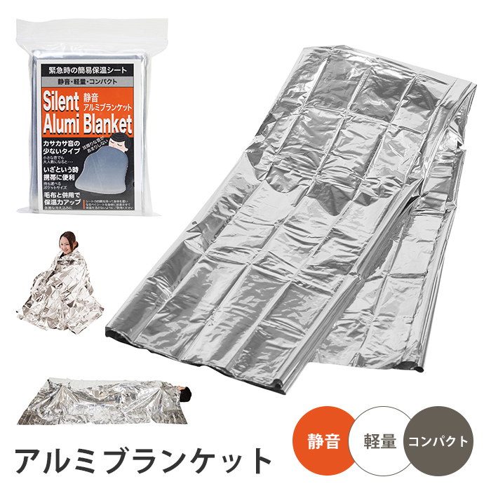 | アルミブランケット 保温シート アルミ ブランケット 保温 寒さをしのぐ 掛ける 包まる 静音 軽量 コンパクト 携帯 非常時 避難 災害 震災 水害 万が一の備え 屋外 レジャー キャンプ アウトドア 静音アルミブランケット |