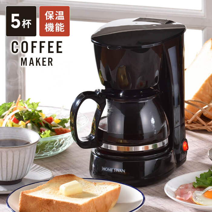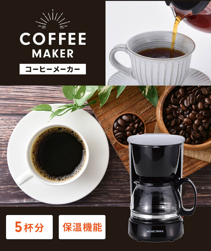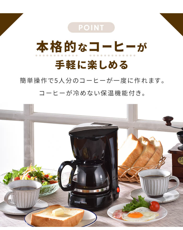 | 本格コーヒーが簡単に楽しめるコーヒーメーカー。 ドリップ後そのまま注げるガラスカップ。 コーヒーが冷めない保温機能、容量がわかる水量計付き。 5人分のコーヒーが一度に出来ます。 ※600ml(120ml/1人分) |