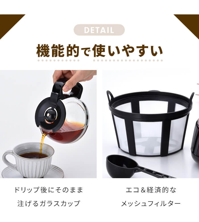 | ・5人分のコーヒーが一度に作れます(1人当たり=120ml) ・ドリップ後にそのまま注げるガラスカップ ・コーヒーが冷めない保温機能付き ・容量がわかる水位目盛り付き ・計量スプーン、メッシュフィルター付属 |