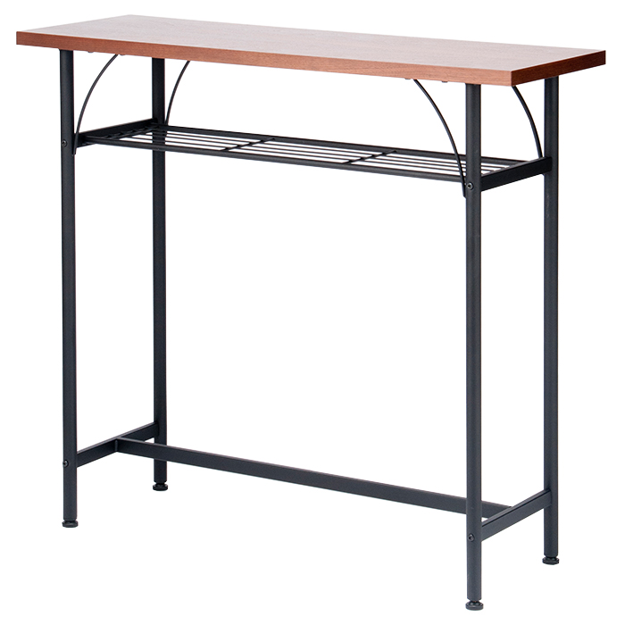 | おうちをカフェやバーのように演出できるカウンターテーブル。 幅100cm、奥行35cmのコンパクトな設計で場所を取らずにスタイリッシュに設置できます。 天板は2.5cm厚の突板でウォールナット木目がインテリア性を高めます。 雑誌やティッシュを置くのに便利な棚板は落下防止の鉄線付き。 中央下は揺れ補強兼足置きとして太パイプを通してあります。 足元はガタツキを微調整できるアジャスター付き。 |