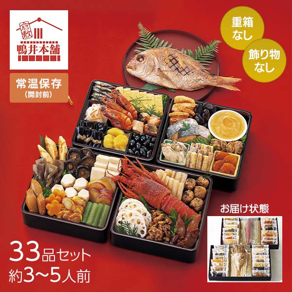 | セット内容・付属品 | 33品セット:田作り、丹波黒黒豆、ふきのうま煮、里芋含め煮、たたきごぼう、富貴ごぼう、鱈のうま煮、一口巻昆布、栗きんとん、味付しいたけ、穂先竹の子、なます、酢れんこん、鰆の柚庵焼、とりつくね、焼ほたて、やりいか姿煮、子持ちいかのうま煮、豚の角煮、くるみ艶煮、焼鯛、だし巻、手綱こんにゃく、梅人参、高野豆腐含め煮、祝海老、イセエビの姿蒸(ミナミイセエビ使用)、あさりのうま煮、紫福豆(珈琲味)、さつまいも黄金煮(レモン煮)、海老チリソース煮、ふかひれ煮、かきと里芋のクリーム煮 |