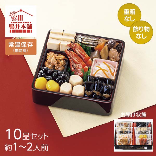 | セット内容・付属品 | 10品セット:田作り、丹波黒黒豆、お煮〆め、里芋含め煮、にしん一口巻昆布、栗の甘露煮、なます、高野豆腐含め煮、祝海老、あさりのうま煮 |