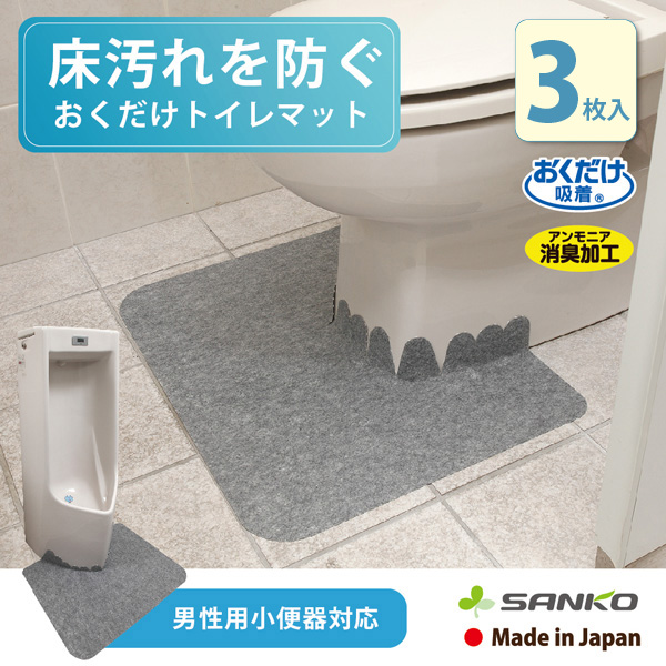 日本製 3枚組のトイレマット。汚れやすい便器の根元もカバーし汚れを防止します。男性小便器にも使用できます。グレーは、汚れが目立ちにくいグレーカラー。