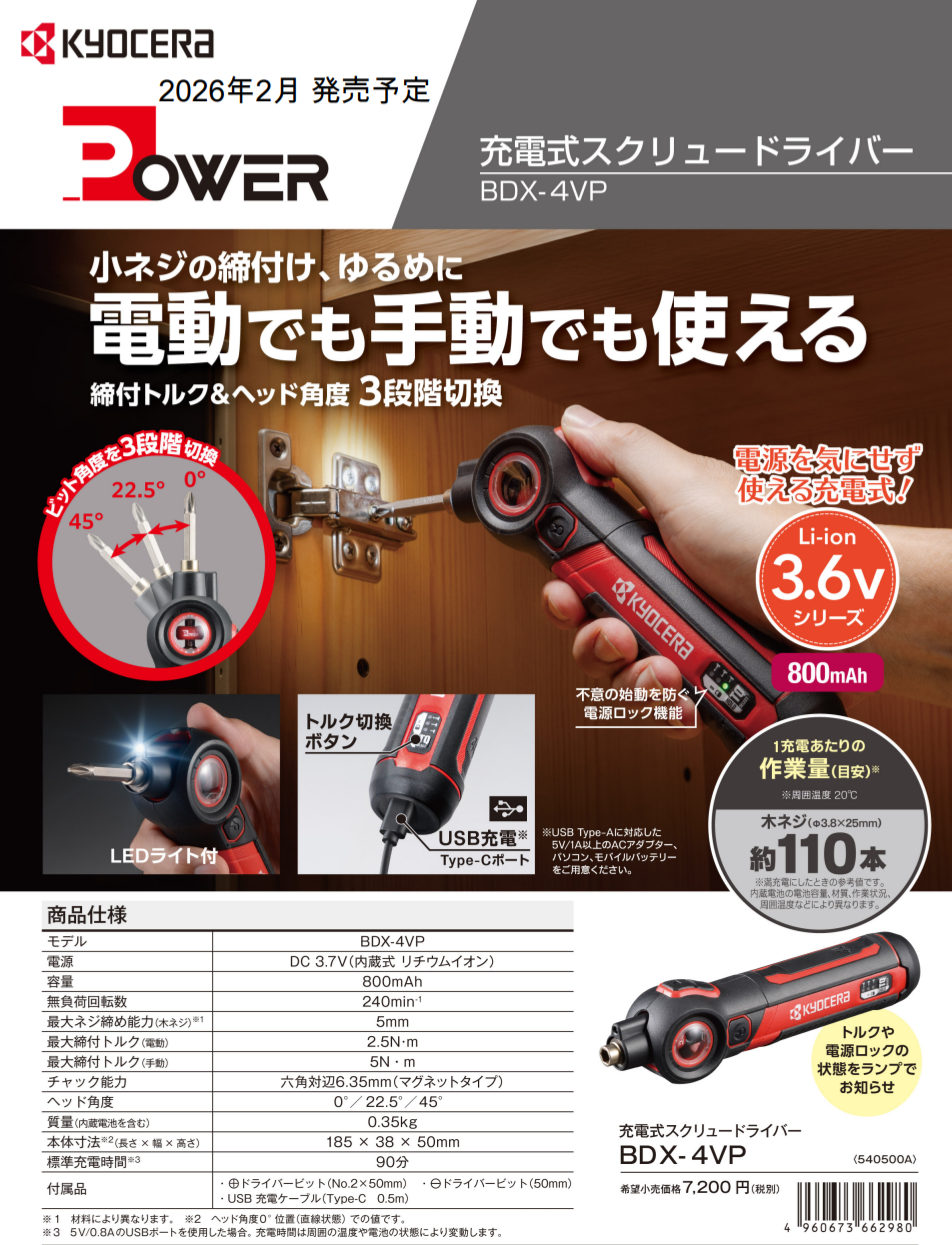 京セラ BDX-4VP 充電式スクリュードライバー 締付トルク ヘッド角度 3段階切替 電動、手動どちらも可 ドライバービット付き