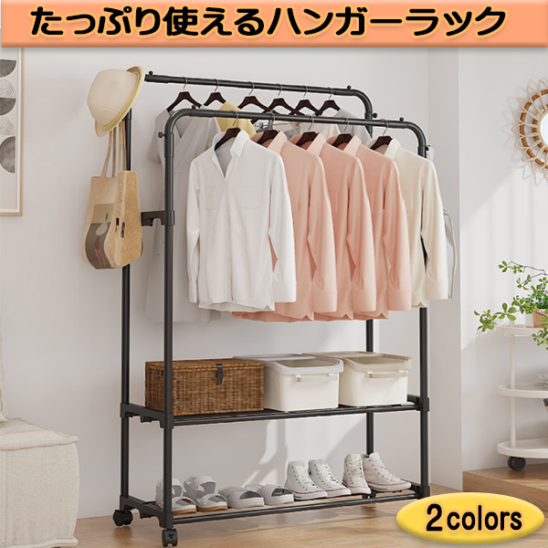 ハンガーラック キャスター付き 2列 2段 おしゃれ 可動棚 ダブル 頑丈 室内物干しスタンド 洋服ラック 洋服 スリム 衣類収納