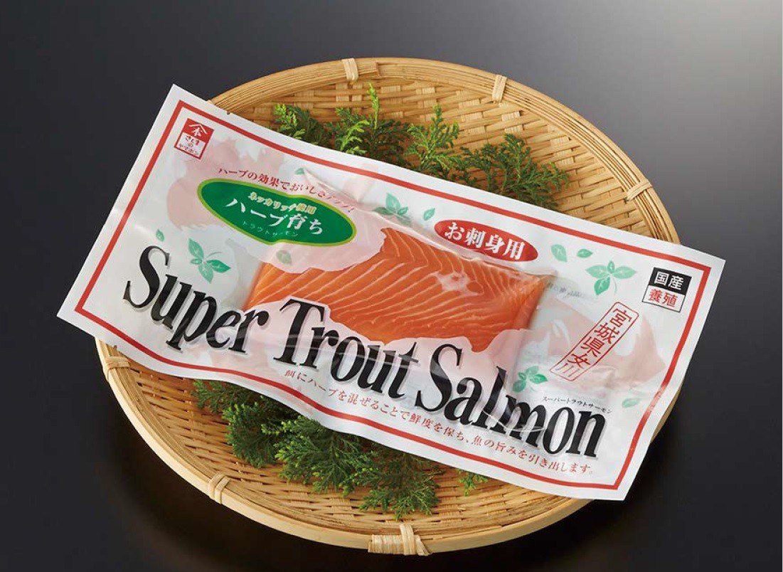 4種のハーブ(オレガノ・シナモン・ジンジャー・ナツメグ)を混ぜた餌を与え養殖したトラウトサーモンです。