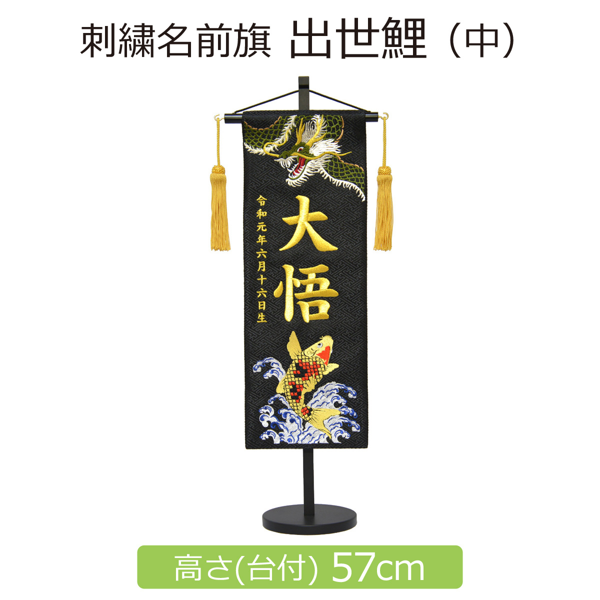 名前旗 刺繍 出世鯉 中 黒 高さ57cm