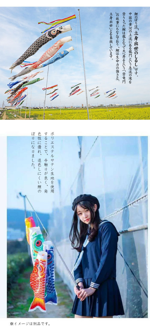 | 特徴 | ★【金箔にこだわる】 ☆サテン地に施した金箔は眩しく輝き、豪華さと躍動感を感じさせます。 ☆淡い金色に地染めをすることで、泳ぐ度にキラキラ輝く豪華絢爛な美しい鯉のぼりに仕上がっています。 ★【色が鮮やかです】 ☆日本画をもとにした写実的なデザインの鯉のぼり。 ☆最高級ポリエステル生地をしたことで、美しい光沢と深みのある色合に仕上がりました。色落ちやかすれの心配が無く発色も良いので、いつまでも綺麗な状態で飾って頂けます。 ☆飽きのこないスタンダードで伝統的な五色の吹流しも人気です。軽やかなナイロン生地は五月の空に美しく舞います。 ★【軽量のポリエステル製】 ☆軽量のナイロン鯉は泳ぎやすく、太陽の光が反射した姿はよく映えます。鯉の取り付けがとても簡単です。箱から出してすぐに飾れます!組み立てもかんたんです! ★【現代デザインの美しい鯉のぼり】 ☆初節句や端午節などお祝い場合で人気飾りです。鯉のぼりセットは円満な家庭を象徴します。男の子に勇気を与えます。 |