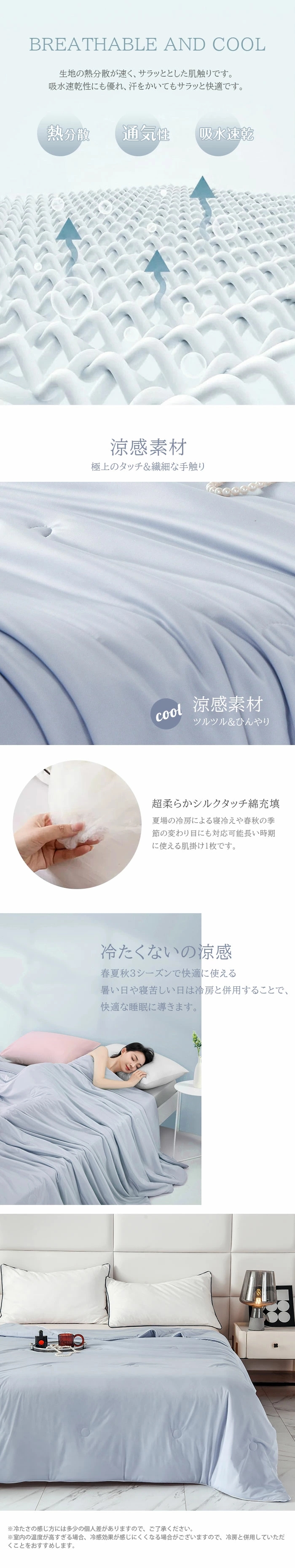 アイスクリームのようなひんやり、生地の熱分散が速く、サラッととした肌触りです。