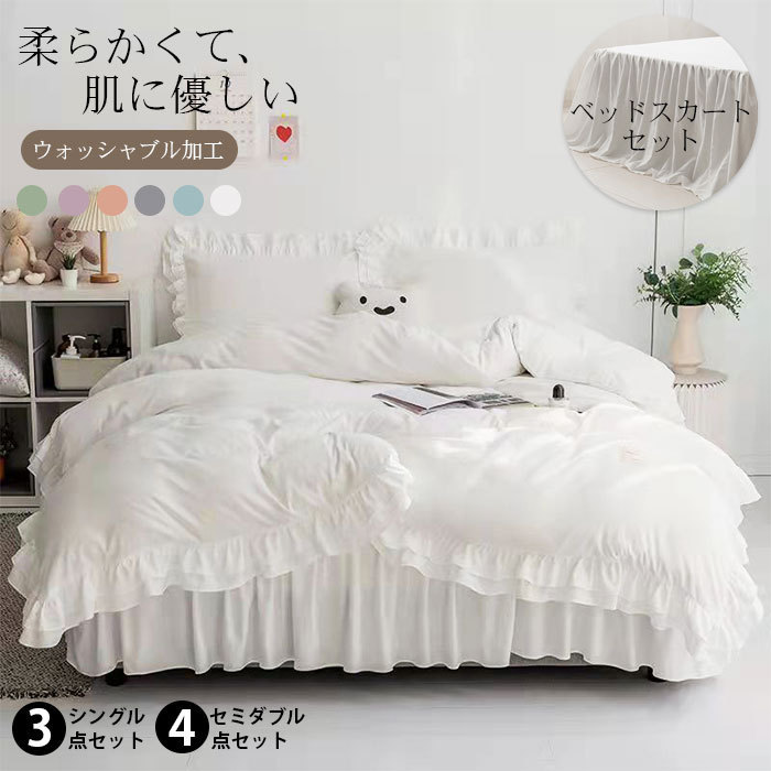 | サイズ | 【Sシングル 3点セット】 ●[布団カバー](約)150×210cm 1枚、[ベッドスカート](約)105cm×210cm+40cm 1枚、[枕カバー](約)43×63cm 1枚 【SDセミダブル 4点セット】 ●[布団カバー](約)170×210cm 1枚、[ベッドスカート](約)120cm×200cm+40cm 1枚、[枕カバー](約)43×63cm 2枚 【Dダブル 4点セット】 [布団カバー](約)190×210cm 1枚、[ベッドスカート](約)140cm×200cm+40cm 1枚、[枕カバー](約)43×63cm 2枚 |