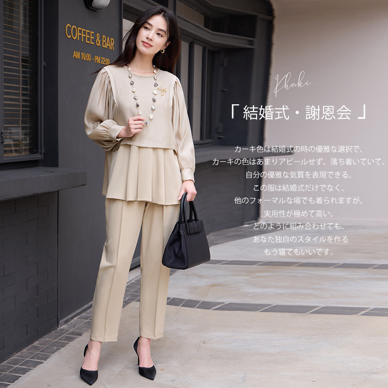 セレモニー ペプラムトップス 上下セット オケージョンスーツ セットアップスーツ アウター ズボン ボトムス ボトム ロングパンツ チュニック丈 フォーマルスーツ マザースーツ タックパンツ 長袖 丸首 ラウンド テーパード スラックス ストレート シャツ ブラウス フリル裾 バックフリル 卒園式 入園式 無地 薄手 裏地 ブラック 黒 ネイビー 紺 紺色 ベージュ ゆったり 仕事 ゴムウエスト 旬 トレンド プラスサイズ オーバーサイズ 大きい 大きめ フリーサイズ フリー S M L LL カジュアル シンプル 大人 大人カジュアル オトナ 女性 綺麗 きれい キレイめ きれいめ 高見え 上質 上品 20代 30代 40代 50代 60代 おしゃれ お洒落 オシャレ カッコいい カッコイイ 春 夏 秋 冬 春夏 秋冬 入学式 卒業式 セレモニースーツ オケージョン レディーススーツ 母 ロング ずぼん ママ ママスーツ 大きいサイズ
