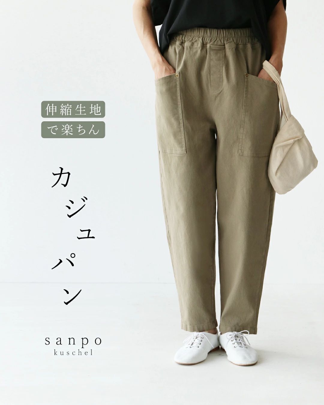 カジュパン sanpo b12816ko ふんわり ウエストゴム カーキ グリーン ポケット テーパード ストレッチ オールシーズン
