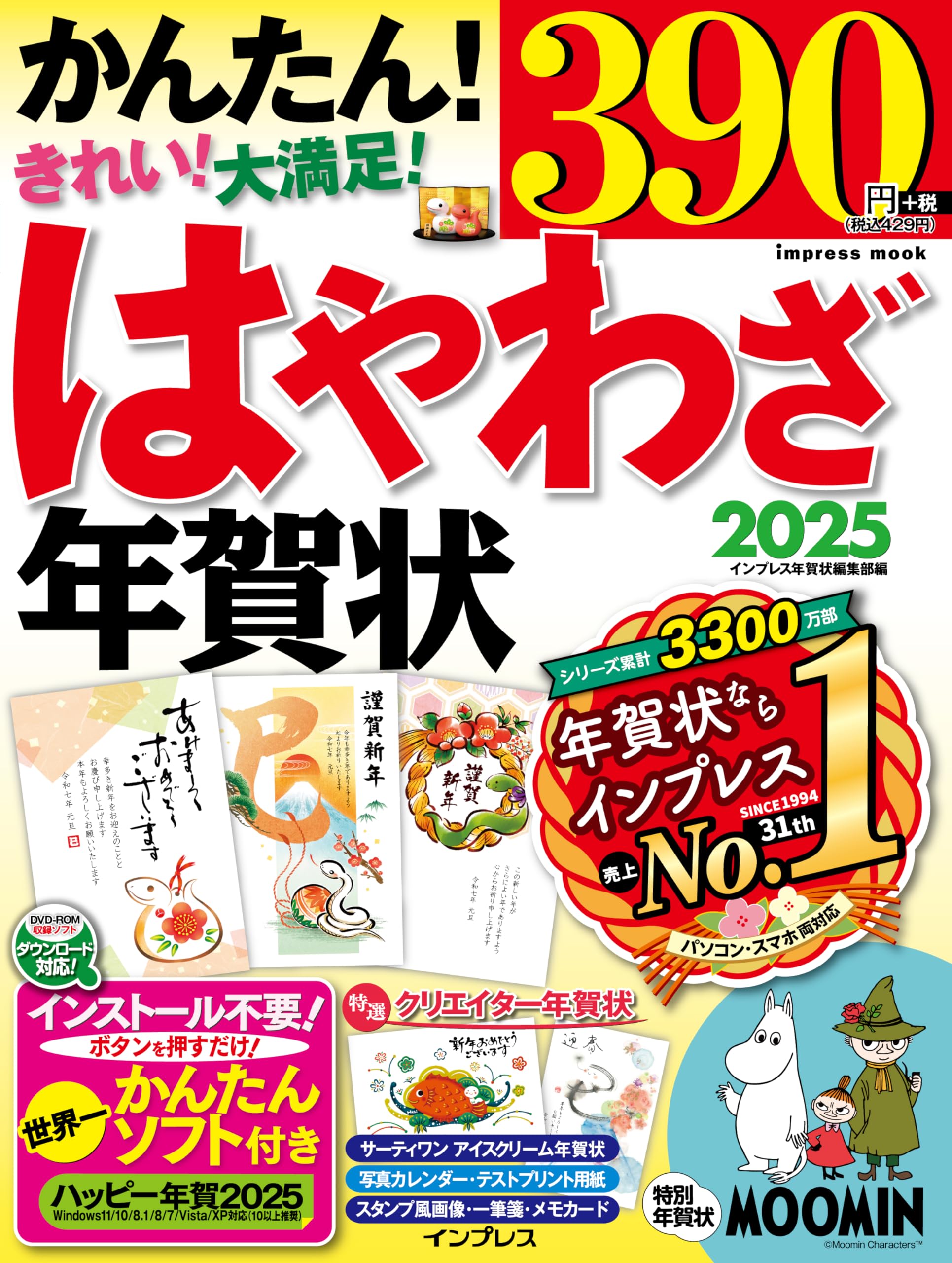 年賀状イラスト、超かんたんソフト、フォント、お試し用紙まで付いて税抜390円 コスパ抜群オールインワン年賀状素材集 定番のフォーマルデザインはもちろん、和風、デジカメ、おしゃれなど 様々なジャンルの年賀状から選りすぐりのデザインをたっぷり収録 誌面カタログは送る相手やテイストで分けられているので、ほしいデザインをサクッと選べます。 本誌限定のスペシャル年賀状が盛り沢山 (1)2025年で誕生80周年特別年賀状「ムーミン」 (2)人気作家の本格イラストが味わえる「特選クリエイター年賀状」 (3)巳年は金運上昇「ゴールドデザイン年賀状」 (4)インプレス年賀状シリーズ31周年特別コラボ「サーティワン アイスクリーム年賀状」 また、スマホでの年末年始の挨拶を楽しくする「スタンプ風画像」 コンパクトサイズでどこでも飾れる「卓上カレンダー」 ぽち袋、福笑い、家計簿などの「便利グッズ」など、うれしい特典も盛りだくさん 文字やはんこなどのパーツ素材も大充実。 年賀状ソフトはかんたん操作で使いやすい「ハッピー年賀2025」を付属。 インストール不要でボタンを押すだけの超かんたんソフトなので、 裏