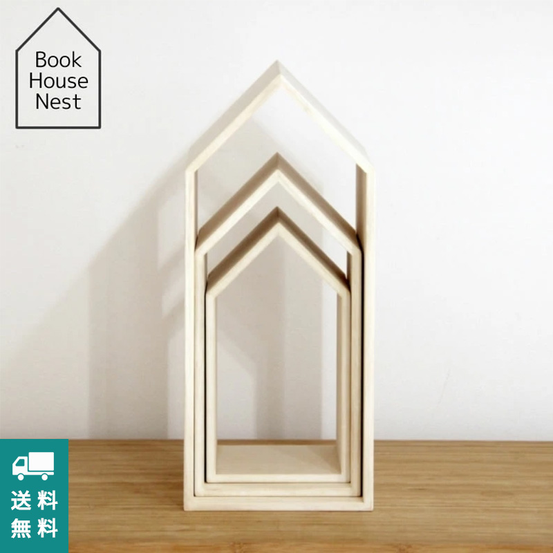 ●お家のカタチがカワイイ桐製のブックエンド、大中小の3サイズが入れ子式の1まとめてになったセット品です。