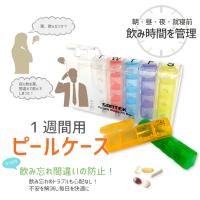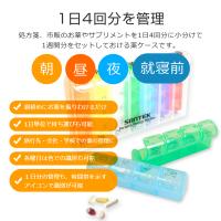 ポイント | ★朝・昼・晩・就寝前…飲み薬の数が増えるほど飲むタイミングを忘れがちになってしまいます。そんな時におすすめなのがこの曜日で管理できるピルケース! ★薬今日飲んだっけ? 夜の薬を朝飲んでしまった! トラブル回避に役立つ、1日4回分を管理できるケースがとっても便利。 ★外出先、仕事に学校、旅行先に持っていくにも便利な小さなサイズ! ★曜日も色で分けられているので、記憶しやすい仕様です。 |