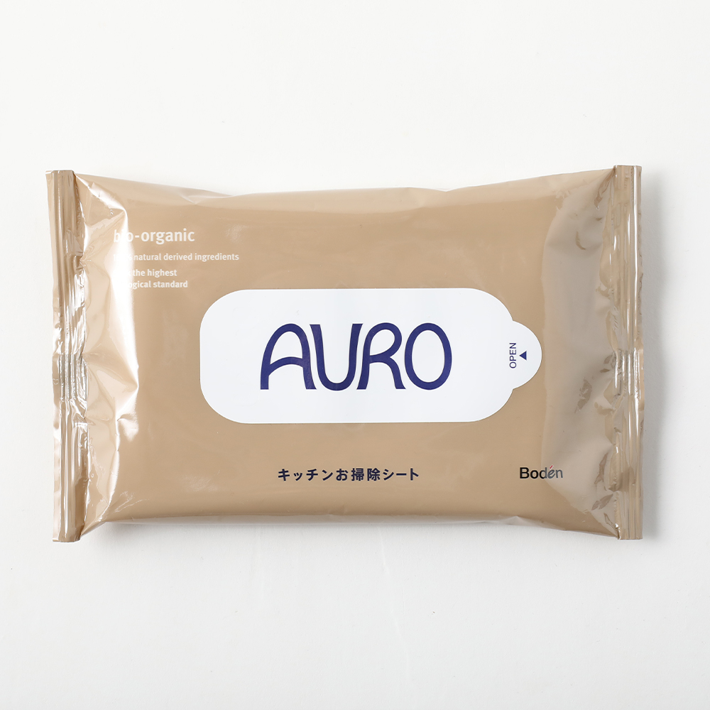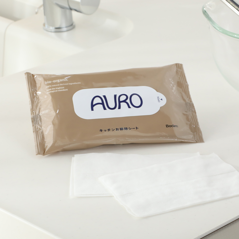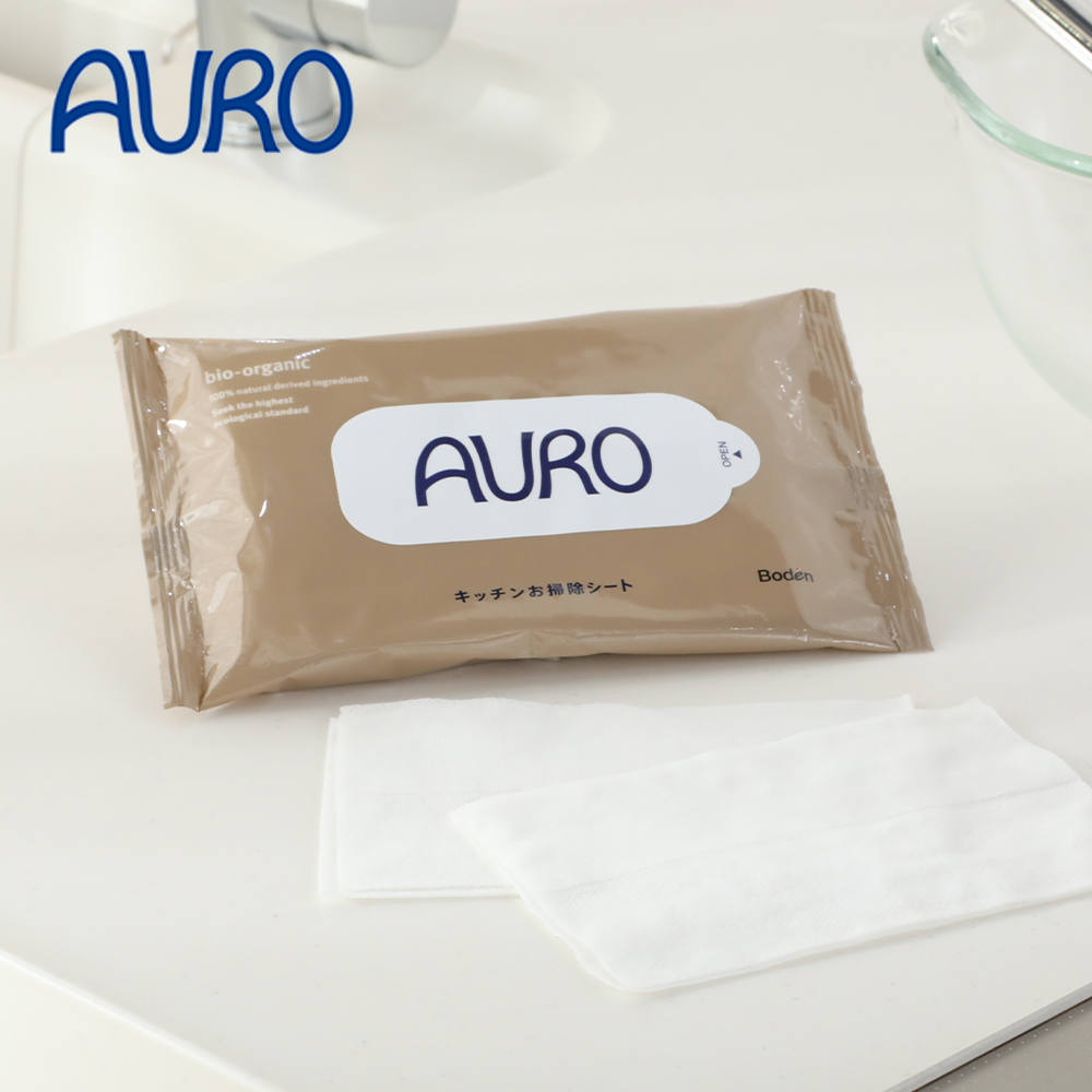 AURO(アウロ) キッチンお掃除シート  油汚れをサッと一拭き。 天然由来成分100%のキッチンお掃除シート。 人と環境に配慮した天然由来成分100%のキッチンお掃除シート。 洗浄成分のアルカリ電解水と重炭酸ナトリウムが、キッチンのしつこい油汚れを手軽に一掃。毎日サッと一拭きすれば汚れ知らずのキッチンに。 界面活性剤不使用でベタつかず、電子レンジやオーブン、冷蔵庫など食品を扱うところにも安心してお使いいただけます。