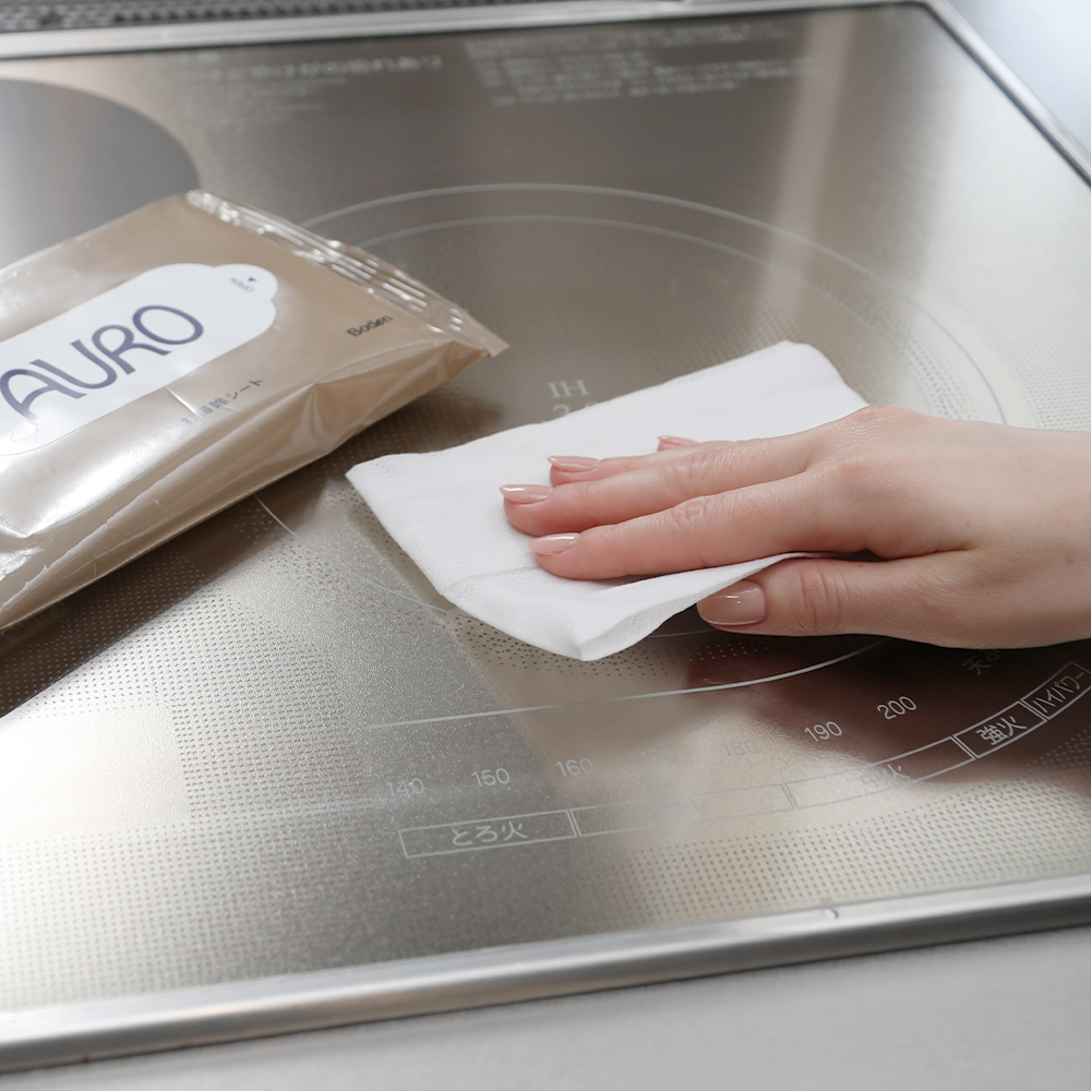 使用方法  ・シートを袋から取り出し、汚れた所を拭いてください。 ・2度拭きは不要です。(気になる場合は水拭きをしてください。) (使用適否が気になる場合は目立たない所で試してから使用してください。) 油汚れの多いガスコンロや換気扇はシートに AURO キッチンお掃除スプレー をかけて拭き取れば、ガンコな汚れにも広範囲に使用できます。