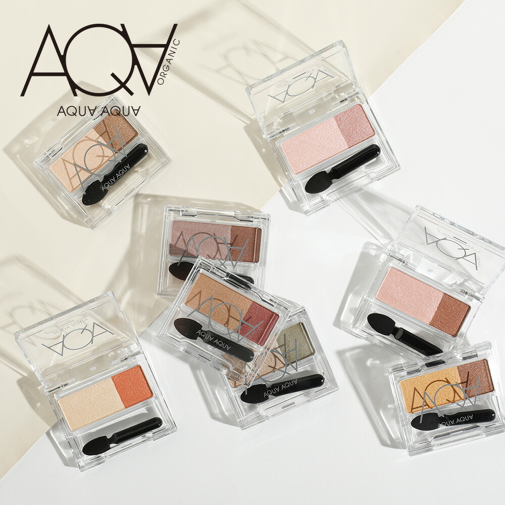 AQUA・AQUA(アクア・アクア) オーガニックデュオシャドー  自然なツヤとパール感で、目元をみずみずしく彩る。 しっとりやわらかなパウダーアイシャドー。 乾燥による小じわなどの悩みを感じやすい目もとにの為に、植物&フルーツオイルを配合したしっとりやわらかいパウダーアイシャドー。