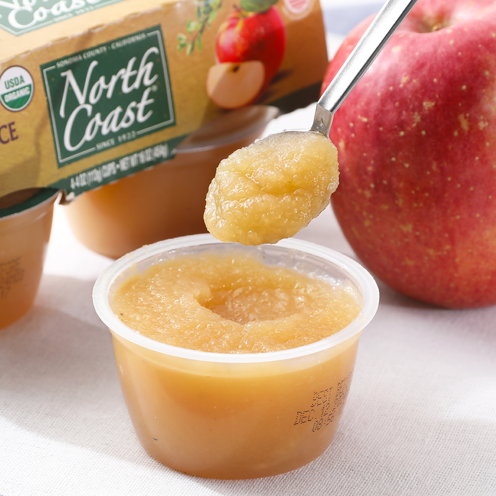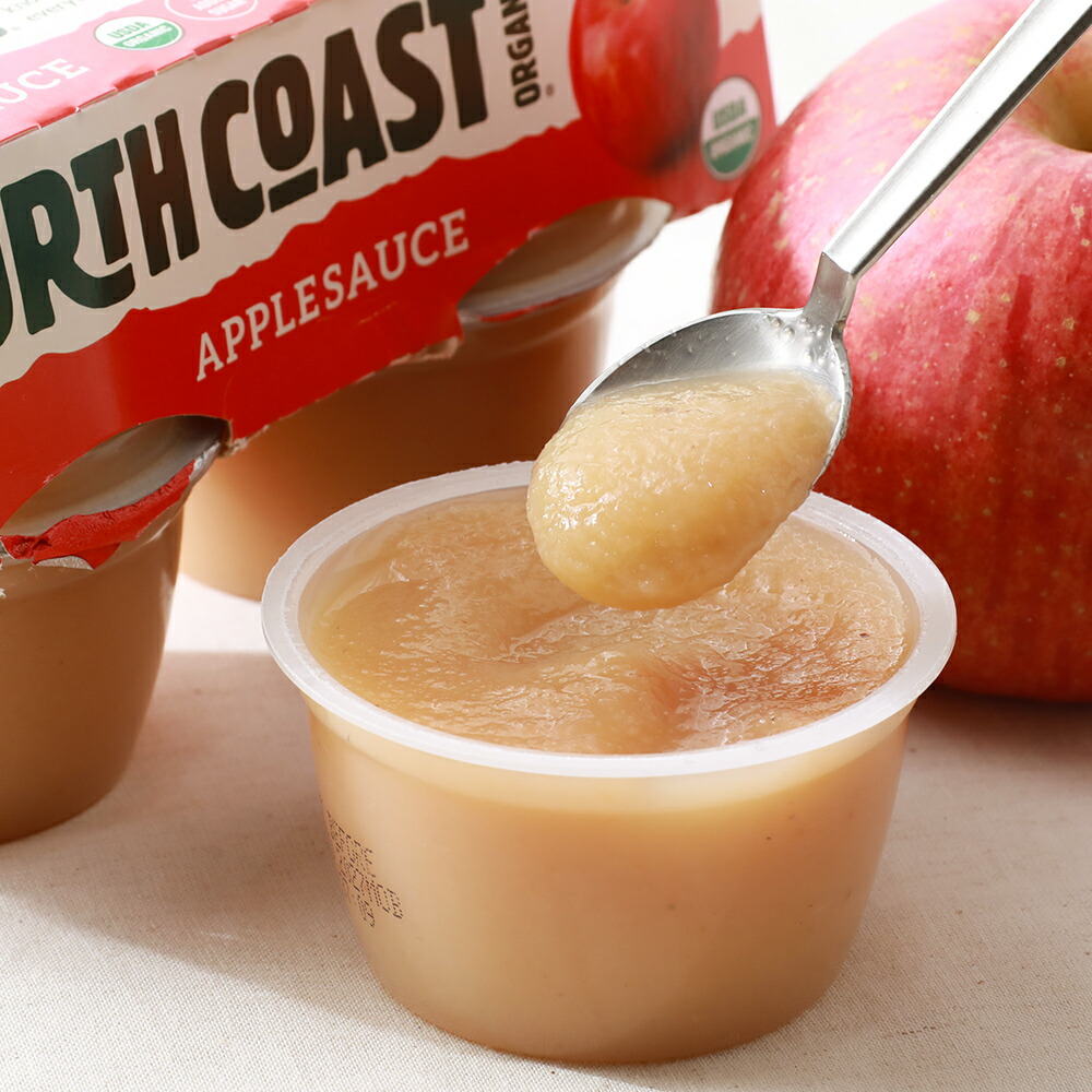 North Coast(ノースコースト) 有機アップルソース(煮つぶしりんご100%) 113g×4カップ  有機りんごをそのままスチームで煮つぶした ネイチャースイートソース あたたかな陽射しのもと、元気に育った有機りんごをそのままスチームで煮つぶしました。 アップルソースとは、アメリカやヨーロッパのスーパーでは必ず売っている人気の食品「煮つぶしりんごペースト」のこと。 子どもの定番のおやつです。 原材料は「有機りんご」だけ!水も化学添加物も保存料も一切不使用 りんごそのもののやさしい甘さとかすかな酸味が美味しい、子どもからお年寄りまでみんなに愛される味です。