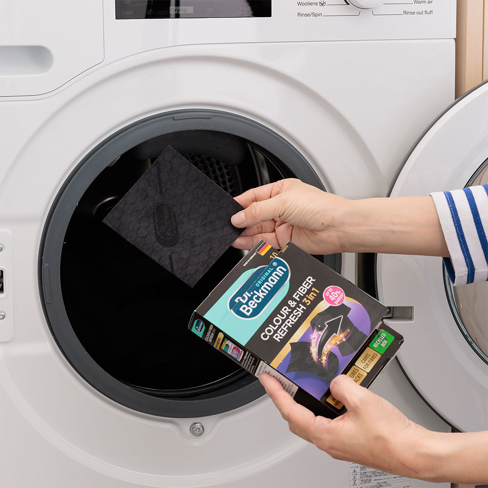 Dr.Beckmann (ドクターベックマン) ブラック&ファイバーリフレッシュ 黒復活シート 10枚入り  衣服のカラーリングとダメージケアで 黒のお洋服を長くきれいに楽しむ。 黒い衣類の悩みと言えば、色褪や毛羽・毛玉などのダメージ。 引き締まる印象の黒色が、なんとなくだらしない感じになっていませんか? その悩みを解決するために開発されたのが、 「ブラック&ファイバーリフレッシュ 黒復活シート」です。 黒復活シートを入れていつも通りお洗濯するだけで、白っぽくなった黒い服が復活! 黒さがよみがえるだけでなく、酵素の力で毛羽や毛玉もなくなり、なめらかになります。