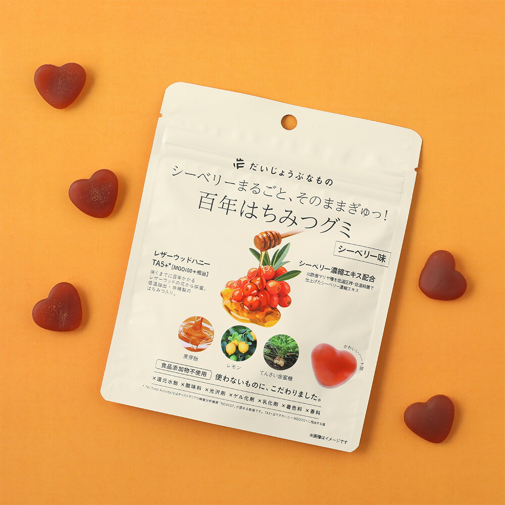 だいじょうぶなもの 百年はちみつグミ シーベリー味  素材まるごと、ぎゅっと閉じ込めた。 美容・健康・美味しさにこだわった、ナチュラルグミ。 食品添加物、上白糖、還元水飴不使用の、ザクロのほのかな酸味とはちみつの甘味が広がるナチュラルグミです。材料には、タスマニア産のレザーウッドハニー(TA5+、MGO100+相当)と豊富な栄養素が含まれているシーベリーの濃縮エキスを配合。シーベリー(別名:サジー/シーバックソーン)には、ビタミン・ミネラル・ポリフェノール・オメガ脂肪酸(3・6・7・9)など、200種類以上の栄養素が自然のままに、ギュッと詰まっており、その豊かさから、“スーパーフルーツ”として世界的にも注目されています。