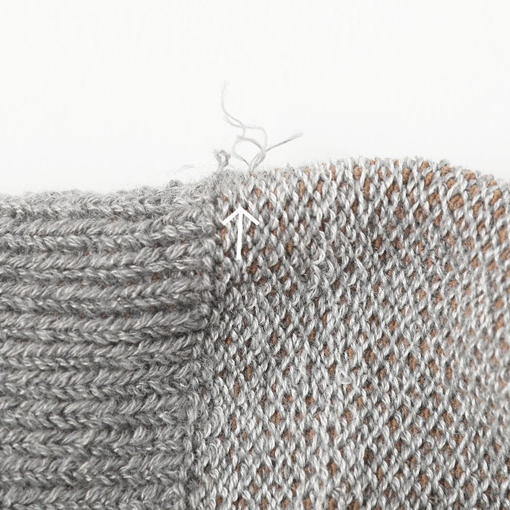 ご理解いただきたいこと 無縫製の特性上、写真のように末端糸が出ていたり、シルク糸がループ状に飛び出すことがありますが、私達も品質として許容しているものになりますので、ご理解いただけますと幸いです。糸はある程度長さを残しており、ここからほつれたりすることはございませんので、切らずにこのまま着用をおねがいします。