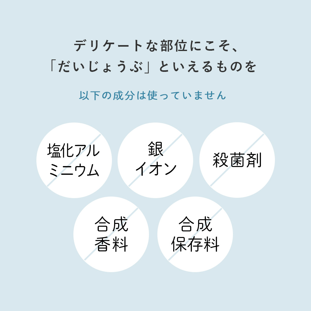 デリケートなワキのために「だいじょうぶ」なものを。 ワキはリンパ節や胸に近い部位、そしてワキの下の皮膚はデリケートかつ、経皮吸収率が高いことに着目し、“使わないもの” にこだわって全成分を厳選しています。 塩化アルミニウム、銀イオン、殺菌剤、合成香料、合成保存料は不使用。 毛穴をふさがずに、肌への負担もありません。