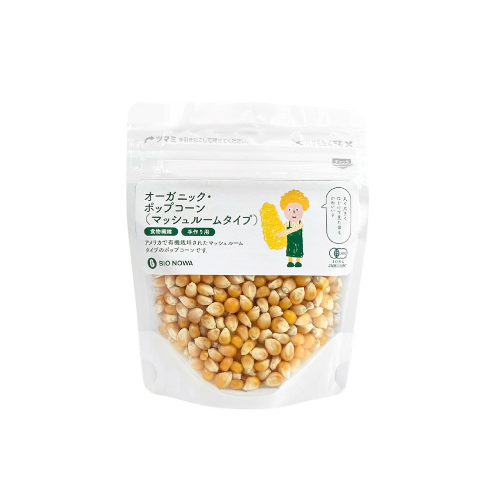 BIO NOWA(ビオノワ) オーガニック・ポップコーン 100g(マッシュルームタイプ)  トウモロコシの豊かな風味が魅力的。 オーガニックにこだわったシンプルなポップコーン。 ポップコーンは、乾燥トウモロコシを加熱してできる。では、普通のトウモロコシを干せばポップコーンを作ることができるのか?…というと、実はそうではありません。