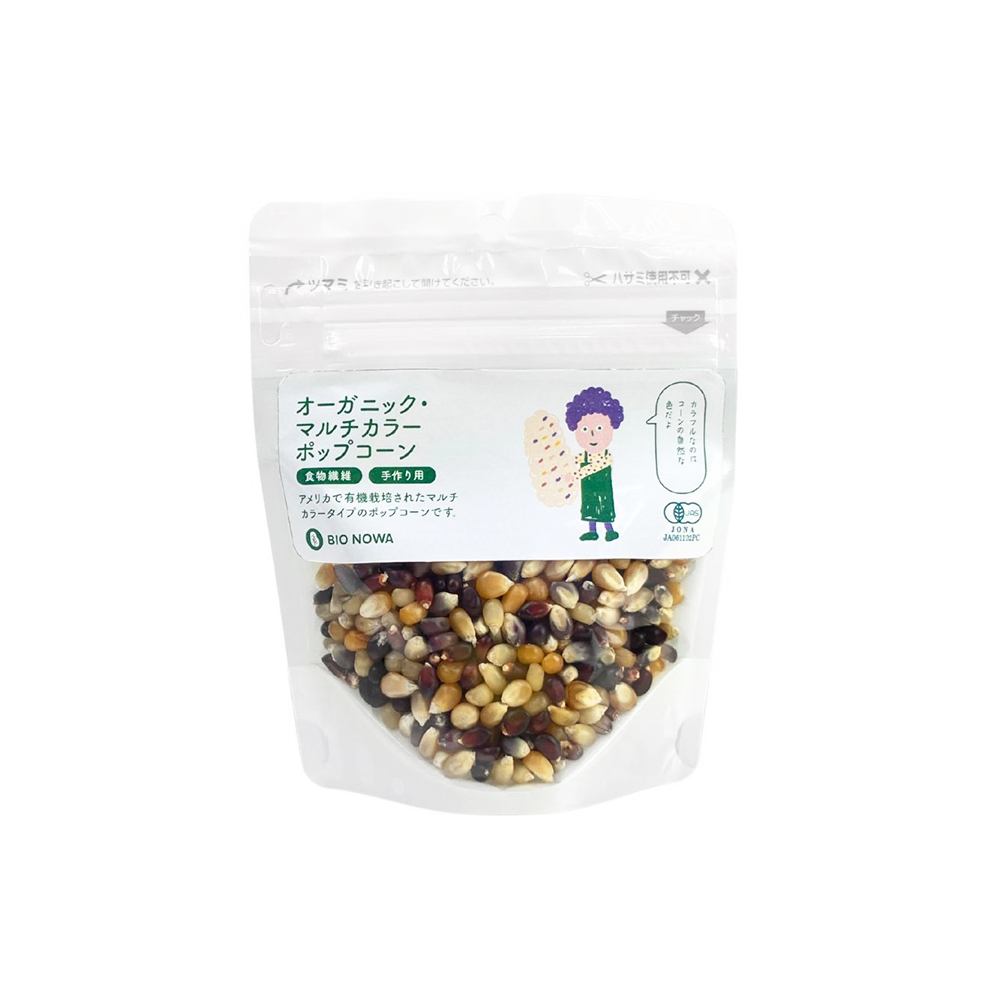 BIO NOWA(ビオノワ) オーガニック・マルチカラーポップコーン 100g  パーティーやおやつにピッタリ。 インパクト大のカラフルポップコーンを、オーガニックで。 ポップコーンは、乾燥トウモロコシを加熱してできる。 では、普通のトウモロコシを干せばポップコーンを作ることができるのか?…というと、実はそうではありません。