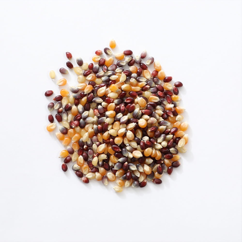 アメリカで有機栽培されたマルチカラーポップコーン。黄、赤、青の色とりどりの粒が特徴で、加熱すると白く弾け、香ばしい風味が楽しめます。