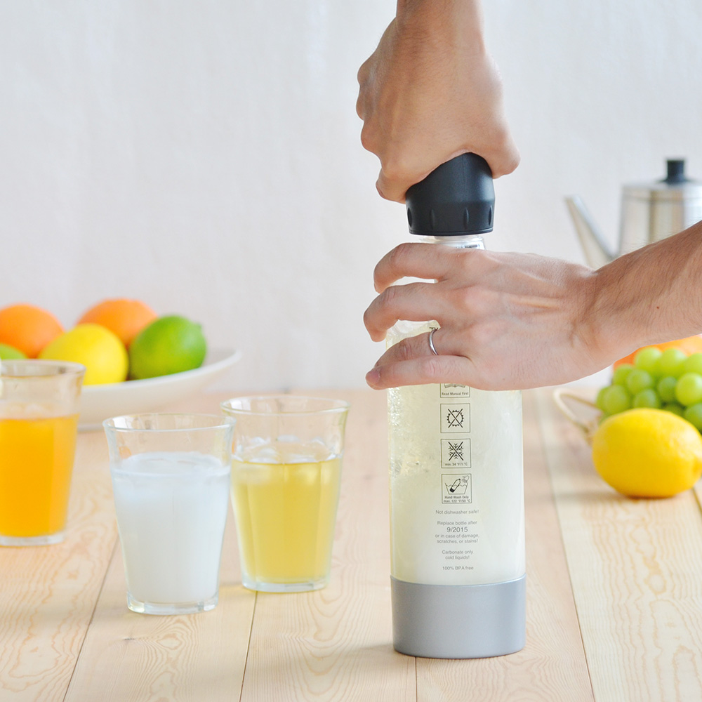 ジュースやお酒で炭酸飲料を作る際の注意 ・繊維質や果肉などの無い飲み物を使用してください。必要があれば、スパークリングする前にろ過してください。 ・濃度の濃い飲み物(100%ジュースなど)は、多量の泡が発生し、ボトルから溢れる場合があります。その場合は、ボトルをきつく締めて60秒ほど待ってから開けて下さい。 ・付け合せや水は、スパークリングの後に加えて下さい。 ・スパークリング後は1分以上待ち、こぼれないようにゆっくりとノズルを取り外してください。 使用できない飲み物 ・乳成分や油分を含んだ飲み物 (カルピスソーダは水を炭酸水にした後、カルピスの原液をそそいでください。) ・固形物を含んだ飲み物 ・50度以上の高温の飲み物