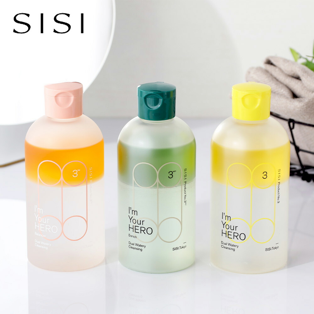 SISI(シシ) アイムユアヒーロー デュアルウォータリークレンジング 230ml (ベルガモット / エンリッチ(ウッディ) / バランサー(ローズマリー))  メイクを落とすだけじゃない。 毛穴をケア*1する、2層式クレンジング。 SISI独自に厳選処方した「オイル層」と「美容液層」をシェイクしてコットンで拭き取る、美容液発想の2層式クレンジングです。ウォータープルーフのメイクから毛穴・皮脂汚れまでやさしく簡単にオフ。さらにポアロイヤル*2が毛穴の汚れを除去して引き締めノイズ※レスなクリアな肌に導きます。ベタつきを感じないみずみずしいテクスチャーでふっくらしっとり柔らかい肌へと導きます。 肌タイプやお悩みにあわせて、3種類をご用意。どのラインナップもW洗顔不要&まつ毛エクステOKなのも嬉しいポイント。肌のつっぱり感が気になる方や、肌にやさしく角質ケアをしたい方におすすめです。 *1 毛穴の汚れを洗浄すること *2 10-ヒドロキシデカン酸(保湿成分)※皮脂などの汚れのこと